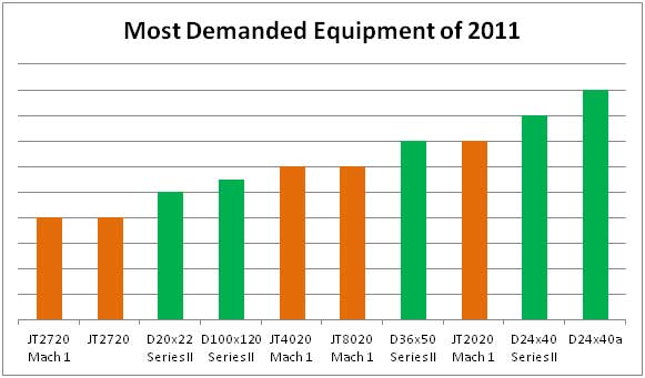 The majority of the units sold in 2011 fall squarely in the 10,000 to 30,000lb size range. This is certainly of no surprise as most of the jobs out there revolve around utility installation and those units have probably the highest degree of flexibility and cross many different industries. All of the top selling units in the above chart except for the D50x100A fall into this size range, giving solid reinforcement to the data.