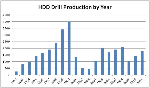 Unfortunately, looking back seven to ten years from 2011 puts us in the 2001 through 2004 range. As a result of the US downturn, all of the major HDD manufacturers saw enormously decreased production of HDD drills from 2002 through 2004.