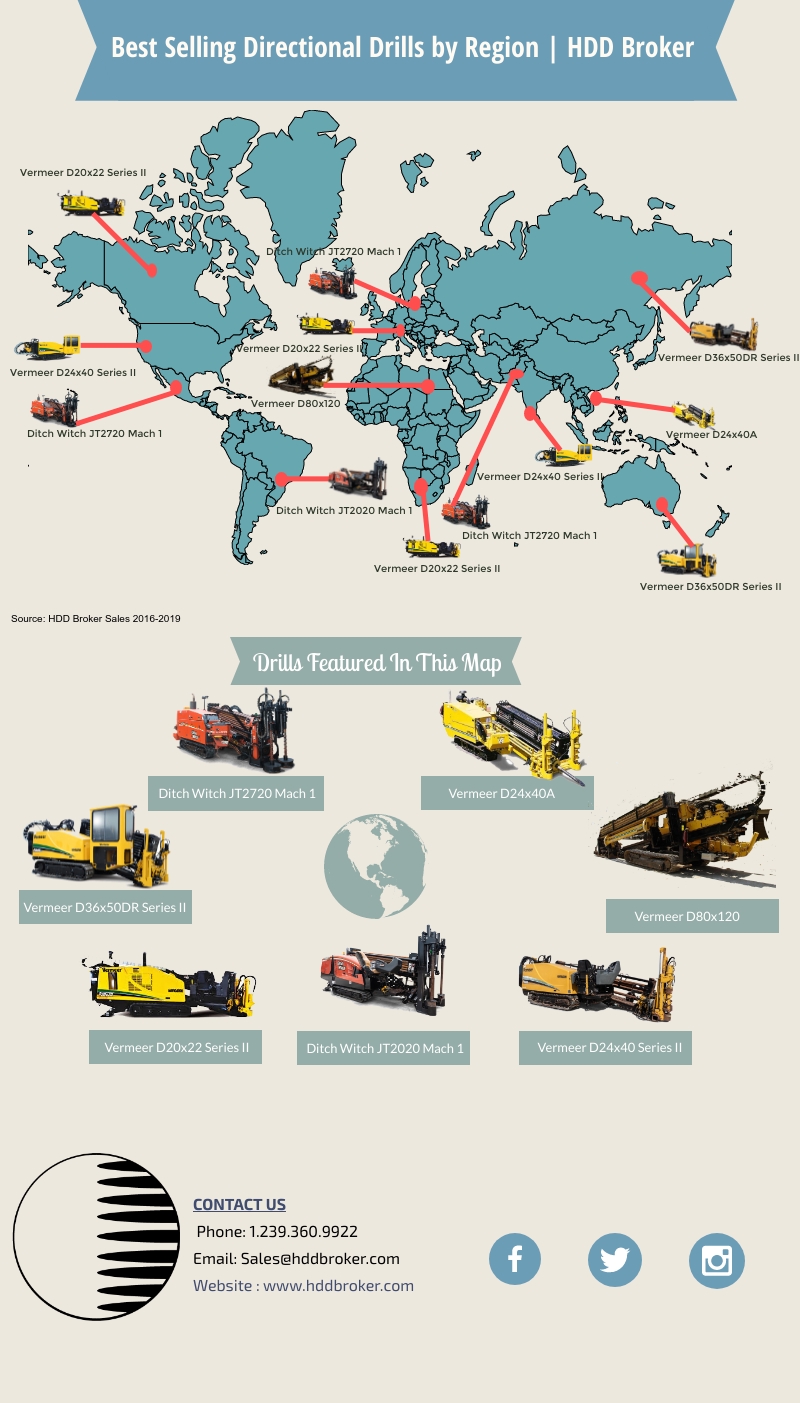 At HDD Broker, we decided to take a look at the statistics from our sales of drills between 2016 – 2019. We were able to find what the best-selling directional drills by region were around the world. We decided to create a fun, and informative infographic for you to explore and see what kind of drills surprised you and which drills you expected to sell well in certain regions. Watch the video for a summarized look at the drills that sold in each region and use the infographic below to find the drill you’ll want to use on your next big project.