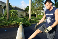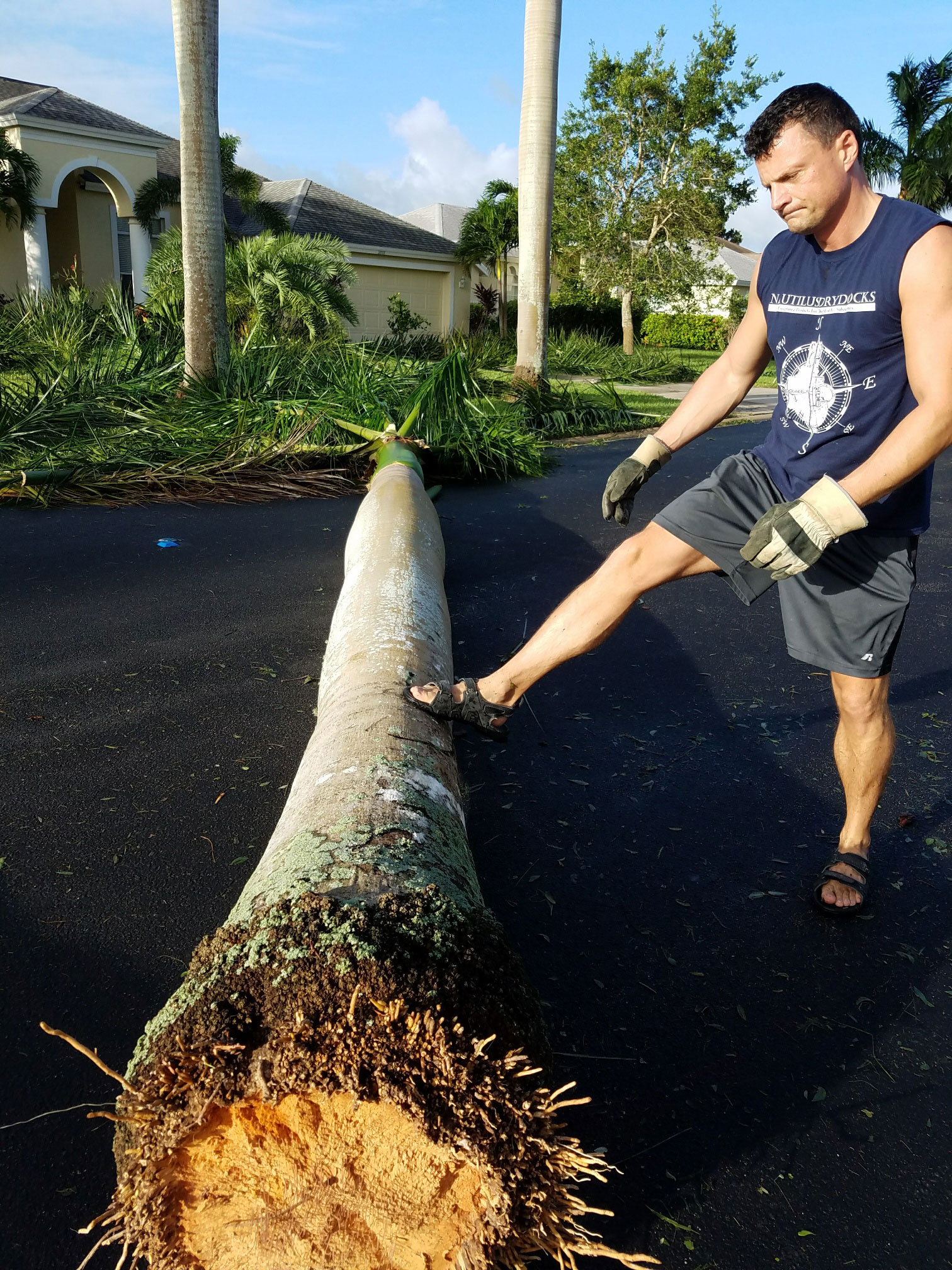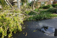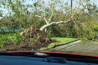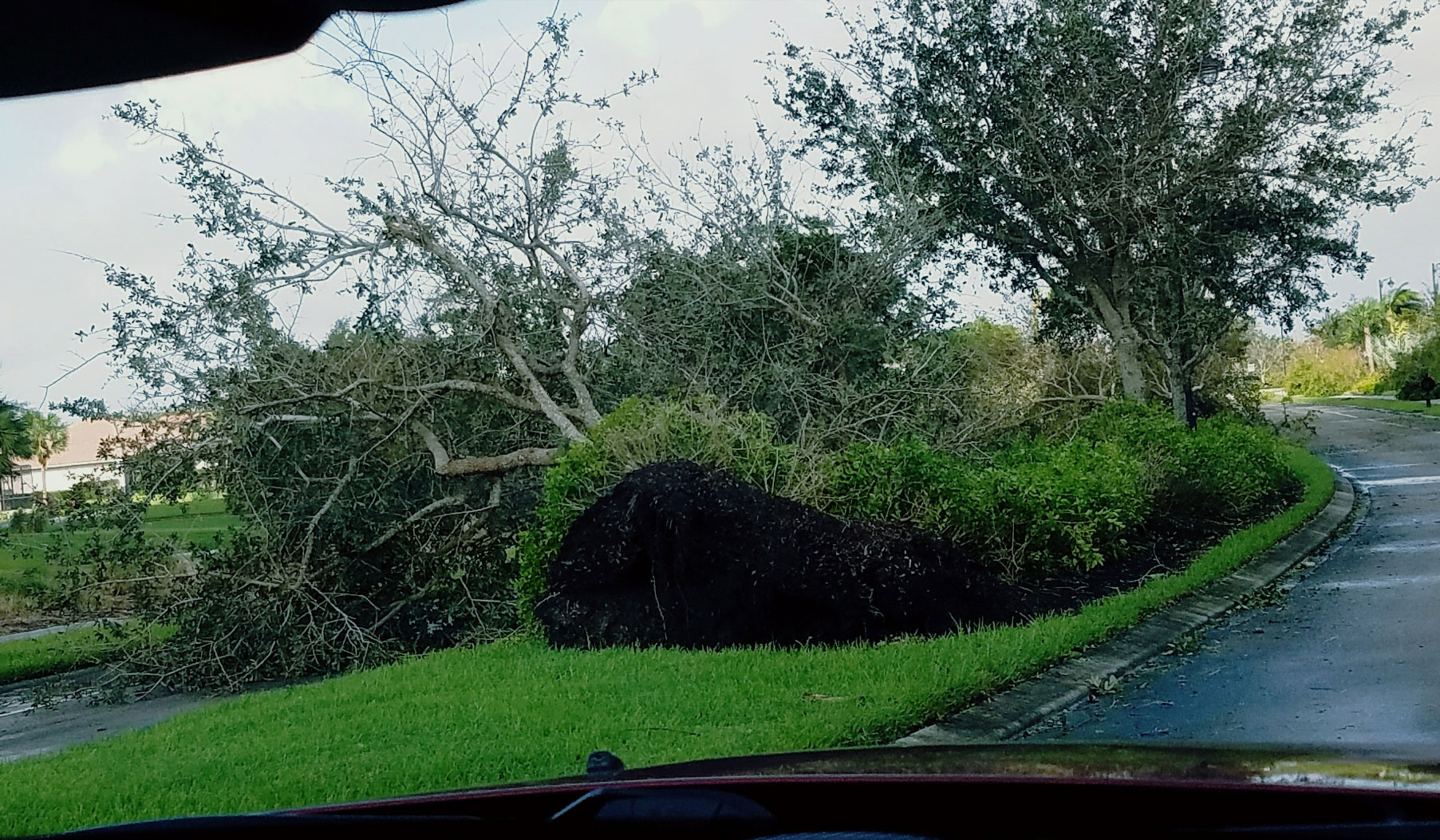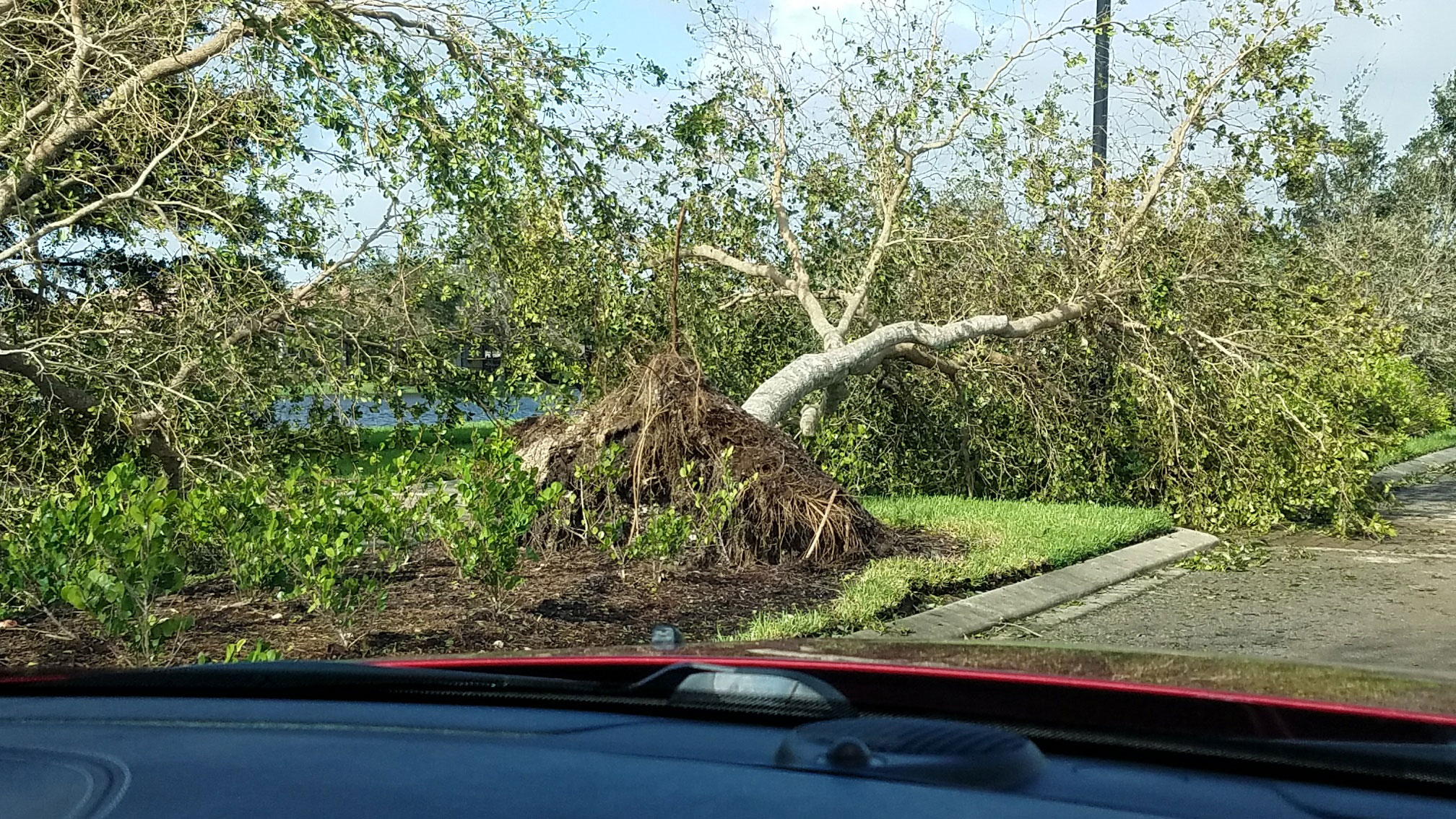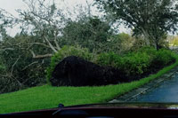 Just when we thought that the house would not be able to get any worse, we entered the eye of the storm and a complete and utter calm descended on us. Light streamed from above, the birds came out and the air was filled with the strong scent of the ocean. We managed to get out and take a look at the damage, which was significant. Trees were shattered and strewn about the neighborhood. Pool cages and fencing were shredded and mangled. Clay roof tiles were smashed by debris or physically torn free by the wind. We had a brief respite of about an hour while the eye slowly passed us by.