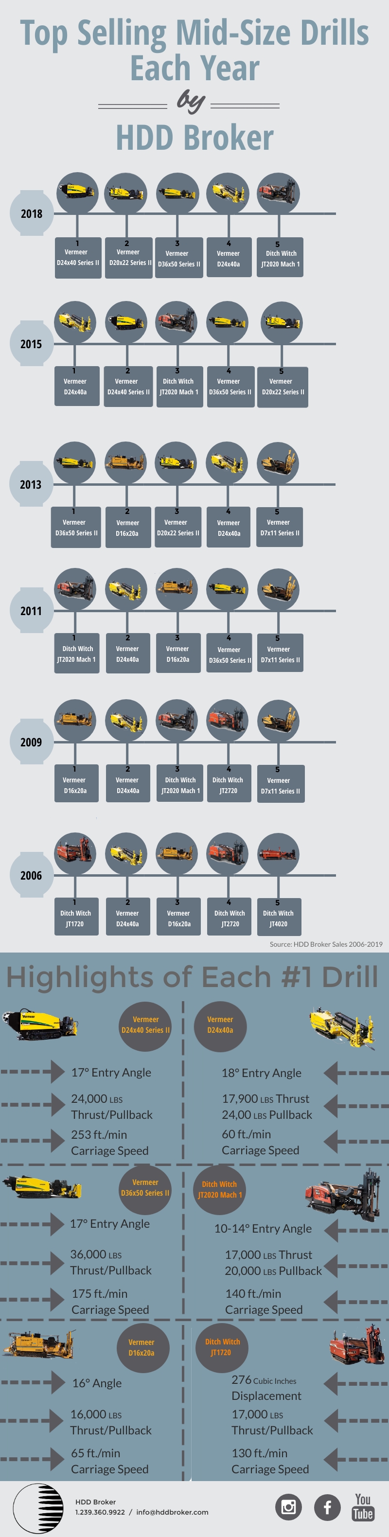 Well we did the work for you! Here at HDD Broker, we took a look at some statistics from our sales all the way back to 2006. We decided to create a visual infographic in order to better show the top five best selling drills for select years from 2018 until 2006. We found some surprises, and some things were expected. One thing we noticed was that Vermeer dominates the more current market, but Ditch Witch ruled the market more before 2010. Interesting things going on here, and these statistics can help us predict what directional drills will sell well in the years to come.